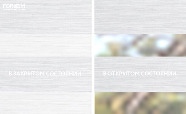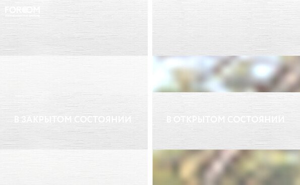 Полотно ткани, состоит из чередующихся горизонтальных полос – прозрачных и непрозрачных. Изменяя положение этих полос относительно друг другу, можно создать целых 3 режима регулировки светом. Например, чтобы в помещении стало светлее, нужно расположить прозрачные полосы друг напротив друга. Если разместить прозрачную и непрозрачную полосу параллельно друг другу, то можно добиться практически полного затемнения.
